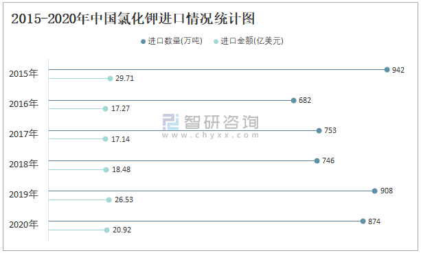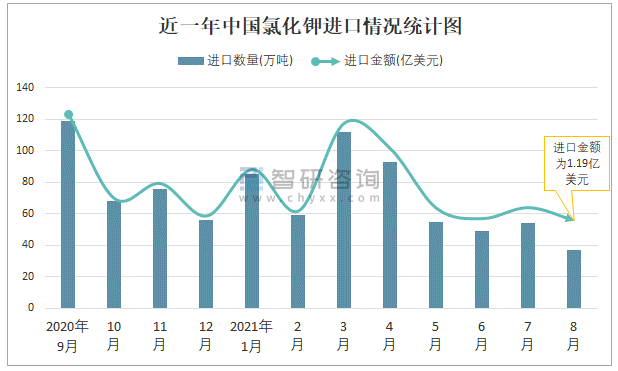 根據中國海關數據顯示:2021年8月中國氯化鉀進口數量為37萬噸,同比下降55%,進口金額為1.19億美元,同比下降34.9%,2021年1-8月中國氯化鉀進口數量為544萬噸,進口金額為13.05億美元。