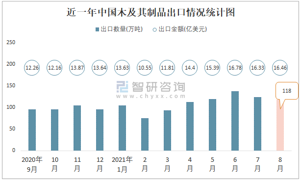 近一年中國木及其制品出口情況統計圖