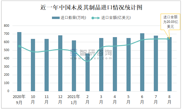 根據中國海關數據顯示:2021年8月中國木及其制品進口數量為661萬噸,同比下降3.7%,進口金額為20.03億美元,同比增長21.7%,2021年8月中國木及其制品出口數量為118萬噸,同比增長33.7%,出口金額為16.46億美元,同比增長39.8%;2021年1-8月中國木及其制品進口數量為5094萬噸,進口金額為138.04億美元,出口數量為884萬噸,出口金額為115.32億美元。