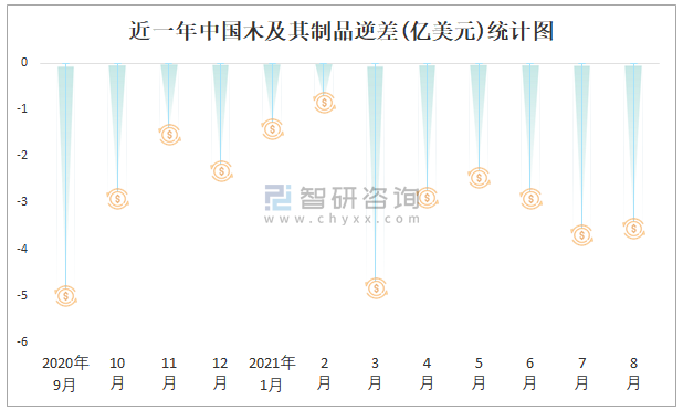 近一年中國木及其制品逆差(億美元)統計圖