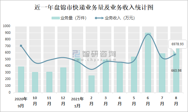 根據各省市郵政局數據可知:2021年8月盤錦市快遞業務量為663.98萬件,業務收入為6978.93萬元;2021年1-8月盤錦市快遞累計業務量為4395.47萬件,同比增長173.13%,累計業務收入為50368.55萬元,同比增長74%;2016-2020年盤錦市快遞業務量與業務收入均逐年遞增,平均單價2017年跌至最低值,此后逐年遞增。