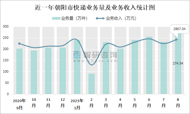 2021年8月朝陽市快遞業務量與業務收入分別為274.34萬件和2867.04萬元