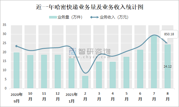 近一年哈密快遞業(yè)務(wù)量及業(yè)務(wù)收入統(tǒng)計(jì)圖