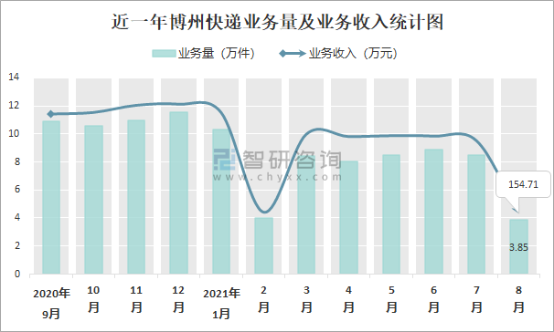 2021年8月博州快遞業務量與業務收入分別為3.85萬件和154.71萬元
