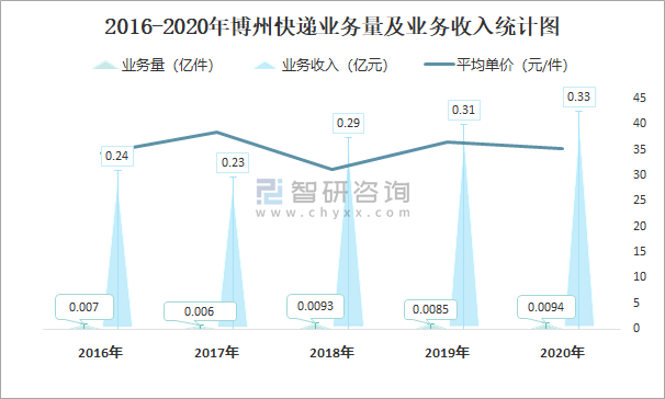 2016-2020年博州快遞業務量及業務收入統計圖