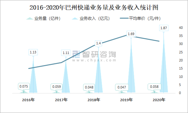 2016-2020年巴州快遞業務量及業務收入統計圖