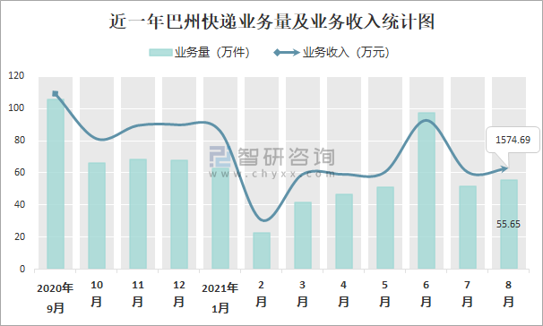 2021年8月巴州快遞業務量與業務收入分別為55.65萬件和1574.69萬元