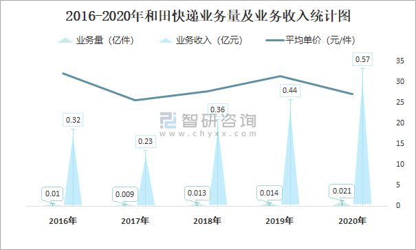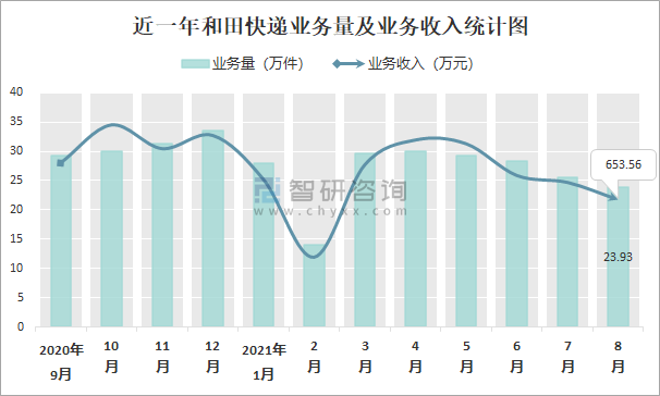 根據各省市郵政局數據可知:2021年8月和田快遞業務量為23.93萬件,業務收入為653.56萬元;2021年1-8月和田快遞累計業務量為208.87萬件,同比增長151.52%,累計業務收入為6020.02萬元,同比增長205.12%;2016-2020年和田快遞業務量與業務收入均2017年起逐年遞增,平均單價總體呈現下降趨勢。