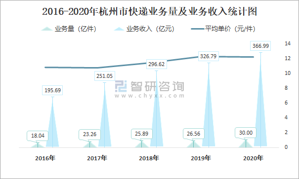 2016-2020年杭州市快遞業(yè)務(wù)量及業(yè)務(wù)收入統(tǒng)計(jì)圖