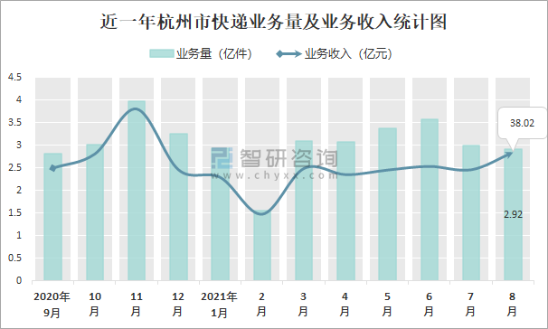 近一年杭州市快遞業(yè)務(wù)量及業(yè)務(wù)收入統(tǒng)計(jì)圖