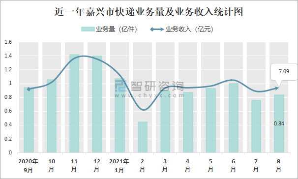 近一年嘉興市快遞業(yè)務(wù)量及業(yè)務(wù)收入統(tǒng)計圖