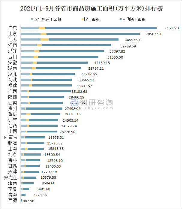 2021年1-9月各省市商品房施工面積(萬平方米)排行榜