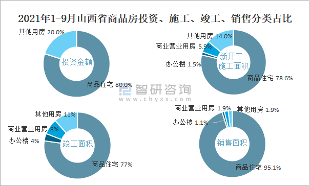 2021年1-9月山西省商品房投資、施工、竣工、銷售分類占比
