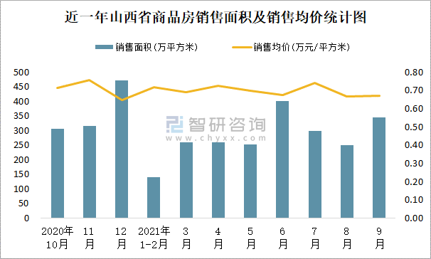 2021年9月山西省銷售商品房345.32萬平方米 銷售均價約為0.67萬元/平方米