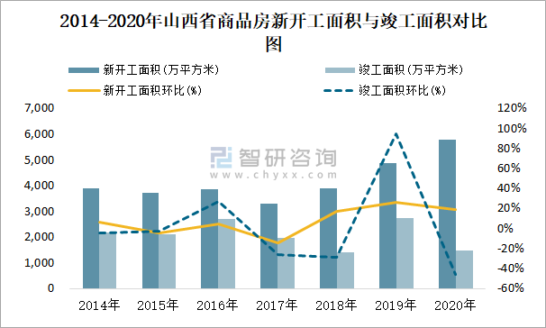 2014-2020年山西省商品房新開工面積與竣工面積對比圖