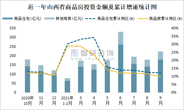 根據國家統計局數據統計可知:2021年9月山西省房地產開發投資商品房投資金額為223.58億元(其中商品住宅為179.4億元,辦公樓、商業營業用房等其他用房44.18億元);2021年1-9月山西省房地產開發投資商品房累計投資金額為1513.32億元,投資金額累計同比增長9.7%。