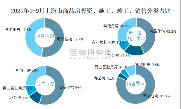 2021年1-9月上海市商品房投資、施工、竣工、銷售分類占比