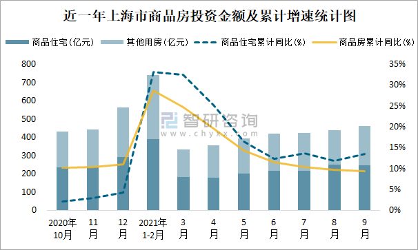 根據國家統計局數據統計可知:2021年9月上海市房地產開發投資商品房投資金額為460.05億元(其中商品住宅為245.73億元,辦公樓、商業營業用房等其他用房214.32億元);2021年1-9月上海市房地產開發投資商品房累計投資金額為3569.93億元,投資金額累計同比增長9.4%。