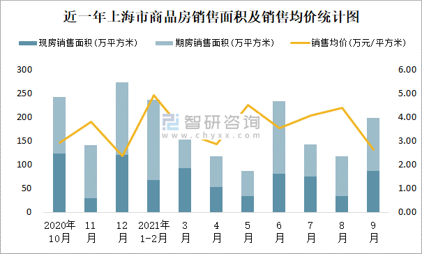 近一年上海市商品房銷售面積及銷售均價統計圖