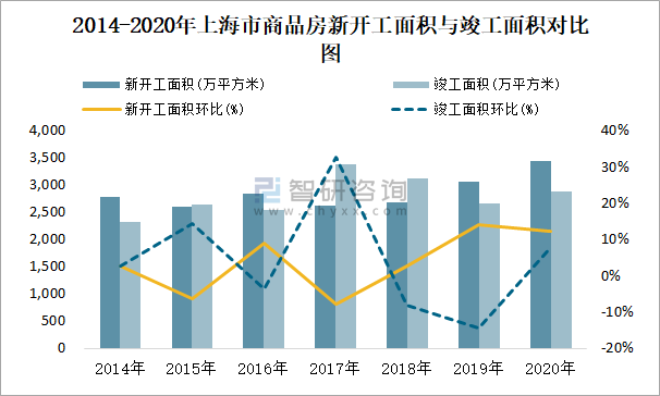 2014-2020年上海市商品房新開工面積與竣工面積對比圖