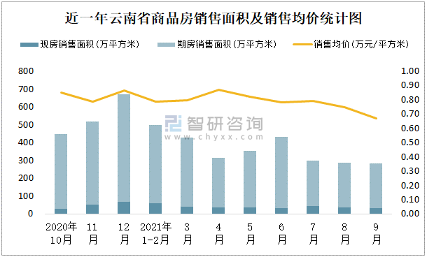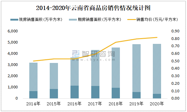 根據(jù)國(guó)家統(tǒng)計(jì)局?jǐn)?shù)據(jù)統(tǒng)計(jì)可知:2021年9月云南省商品房銷售面積為283.19萬(wàn)平方米(其中銷售現(xiàn)房32.72萬(wàn)平方米,期房250.47萬(wàn)平方米),銷售額為189.49億元,銷售均價(jià)約為0.67萬(wàn)元/平方米;2021年1-9月云南省商品房累計(jì)銷售面積為2886.1萬(wàn)平方米,銷售面積累計(jì)同比下降10.4%,累計(jì)銷售額為2265.24億元,銷售額累計(jì)同比下降13%;2014-2020年云南省商品房總銷售面積2015年跌至最低值,此后總體呈現(xiàn)上升趨勢(shì),其中期房銷售面積大大高于現(xiàn)房銷售面積,銷售均價(jià)2020年達(dá)到最高值,此后有所下滑。