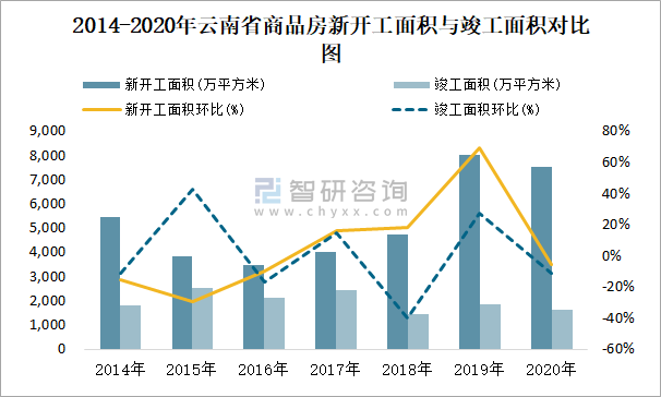 2014-2020年云南省商品房新開工面積與竣工面積對(duì)比圖