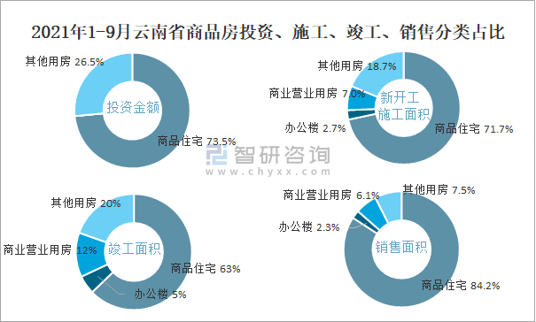 2021年1-9月云南省商品房投資、施工、竣工、銷售分類占比