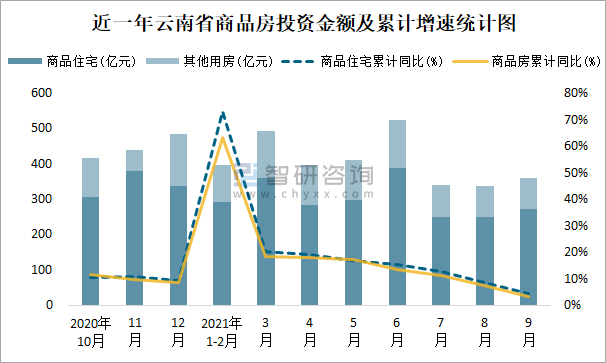 根據(jù)國(guó)家統(tǒng)計(jì)局?jǐn)?shù)據(jù)統(tǒng)計(jì)可知:2021年9月云南省房地產(chǎn)開發(fā)投資商品房投資金額為361.07億元(其中商品住宅為273.22億元,辦公樓、商業(yè)營(yíng)業(yè)用房等其他用房87.85億元);2021年1-9月云南省房地產(chǎn)開發(fā)投資商品房累計(jì)投資金額為3263.8億元,投資金額累計(jì)同比增長(zhǎng)3.3%。