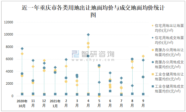 近一年重慶市各類用地出讓地面均價與成交地面均價統計圖