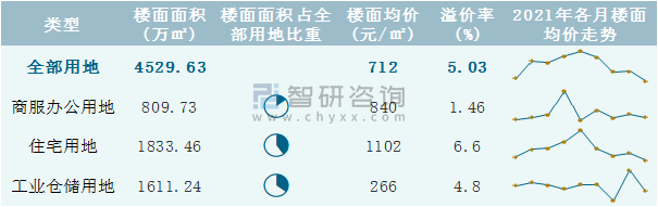 根據(jù)國(guó)信房地產(chǎn)信息網(wǎng)數(shù)據(jù)統(tǒng)計(jì)可知:2021年9月云南省全部用地出讓地面均價(jià)為1567元/㎡,其中住宅用地出讓地面均價(jià)最高(3181元/㎡),全部用地成交地面均價(jià)為909元/㎡,其中住宅用地成交地面均價(jià)為1843元/㎡,高于商服辦公用地成交地面均價(jià);2021年1-9月云南省住宅用地樓面面積占其全部用地比重最多,為40.48%,溢價(jià)率為6.6%。