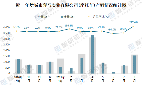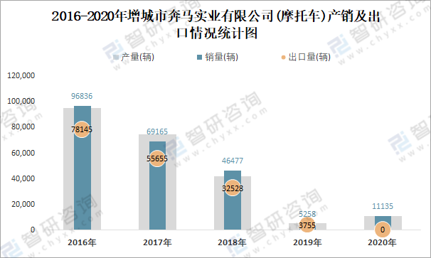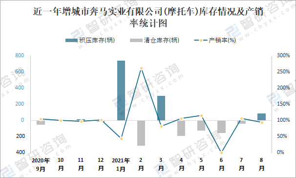 根據中國汽車工業(摩托車)產銷快訊數據顯示:2021年8月增城市奔馬實業有限公司(摩托車)產量為1655輛,同比增長288.5%,銷量為1566輛,同比增長277.35%;2021年1-8月增城市奔馬實業有限公司(摩托車)累計產量為9474輛,同比增長28.5%,累計銷量為9174輛,同比增長25.05%;2016-2020年增城市奔馬實業有限公司(摩托車)產銷量2019年跌至最低值,次年有所回升,且近5年總銷量大于總產量,清倉庫存1527輛,2020年銷量以內銷為主。