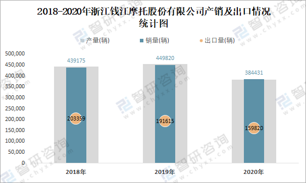 2018-2020年浙江錢江摩托股份有限公司產銷及出口情況統計圖