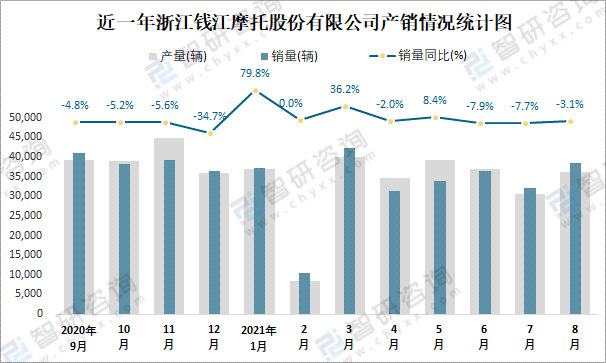根據中國汽車工業(摩托車)產銷快訊數據顯示:2021年8月浙江錢江摩托股份有限公司(摩托車)產量為36252輛,同比增長3.21%,銷量為38560輛,同比下降3.13%;2021年1-8月浙江錢江摩托股份有限公司(摩托車)累計產量為262910輛,同比增長17.15%,累計銷量為262315輛,同比增長14.29%;2018-2020年浙江錢江摩托股份有限公司(摩托車)產銷量2019年達到最高值,此后有所下滑,且近3年總產量大于總銷量,積壓了庫存7775輛,出口量偏少,銷量以內銷為主。