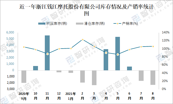 近一年浙江錢江摩托股份有限公司庫存情況及產銷率統計圖
