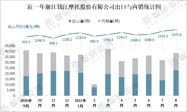根據中國汽車工業(摩托車)產銷快訊數據統計可知:近一年浙江錢江摩托股份有限公司(摩托車)共積壓庫存4568輛,其產銷率存在一定幅度波動,2月產銷率最高(122.93%),清倉庫存1939輛,5月產銷率偏低(86.44%),積壓庫存5311輛;近一年浙江錢江摩托股份有限公司(摩托車)出口量偏少,銷量以內銷為主,總出口量占比總銷量的53.8%,出口均價8月達到最高值,其中8月出口量為23035輛,出口均價約為1433.64美元/輛;2021年1-8月浙江錢江摩托股份有限公司(摩托車)累計出口量為141572輛,同比增長83.94%,累計出口金額約為16980.25萬美元,同比增長131.46%。