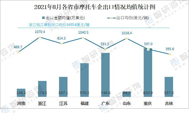 根據中國汽車工業(摩托車)產銷快訊與企查查數據統計可知:2021年8月91家車企摩托車銷量為1681888輛,出口總金額約為45710.77萬美元(其中有兩家子公司,其數據已包含在母公司中,不參加行業匯總);2021年8月91家車企擁有20年以上企業年齡的銷量最高,從企業資本性質來看,銷量占比最大的為內資企業(部分上市公司股份不明確的企業未統計在內),從企業人員規模來看,擁有1000-9999人員規模的車企銷量占比最大,非上市公司銷量占比最高。91家車企主要分布在10個省(市),其中廣東車企最多(25個),部分省市車企不出口,從出口金額均值來看,重慶車企(18家企業)出口金額均值最高,浙江錢江摩托股份有限公司約為1433.6美元/輛,高于浙江出口均價。