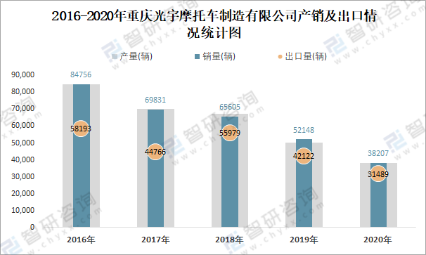 2016-2020年重慶光宇摩托車制造有限公司產銷及出口情況統計圖