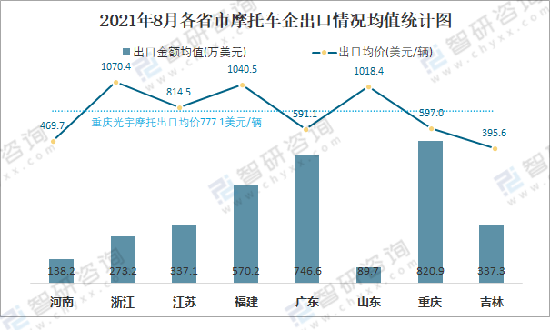 根據中國汽車工業(摩托車)產銷快訊與企查查數據統計可知:2021年8月91家車企摩托車銷量為1681888輛,出口總金額約為45710.77萬美元(其中有兩家子公司,其數據已包含在母公司中,不參加行業匯總);2021年8月91家車企擁有20年以上企業年齡的銷量最高,從企業資本性質來看,銷量占比最大的為內資企業(部分上市公司股份不明確的企業未統計在內),從企業人員規模來看,擁有1000-9999人員規模的車企銷量占比最大,非上市公司銷量占比最高。91家車企主要分布在10個省(市),其中廣東車企最多(25個),部分省市車企不出口,從出口金額均值來看,重慶車企(18家企業)出口金額均值最高,重慶光宇摩托車制造有限公司約為777.1美元/輛,高于重慶出口均價。