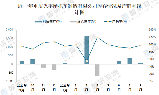 近一年重慶光宇摩托車制造有限公司庫存情況及產銷率統計圖