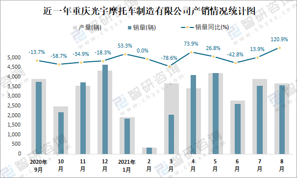 根據中國汽車工業(摩托車)產銷快訊數據顯示:2021年8月重慶光宇摩托車制造有限公司(摩托車)產量為3658輛,同比增長137.69%,銷量為3577輛,同比增長120.94%;2021年1-8月重慶光宇摩托車制造有限公司(摩托車)累計產量為25224輛,同比增長5.89%,累計銷量為23252輛,同比下降2.87%;2016-2020年重慶光宇摩托車制造有限公司(摩托車)產銷量逐年遞減,且近5年總銷量大于總產量,清倉庫存255輛,總體銷量以出口為主。
