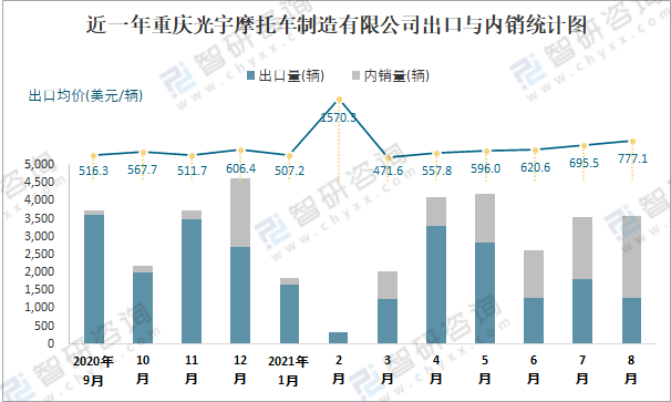 根據中國汽車工業(摩托車)產銷快訊數據統計可知:近一年重慶光宇摩托車制造有限公司(摩托車)共積壓庫存1619輛,其產銷率存在一定幅度波動,4月產銷率最高(119.69%),清倉庫存674輛,3月產銷率偏低(55.45%),積壓庫存1636輛;近一年重慶光宇摩托車制造有限公司(摩托車)銷量以出口為主,總出口量占比總銷量的70.3%,出口均價3月跌至最低值,此后逐月遞增,其中8月出口量為1286輛,出口均價約為777.06美元/輛;2021年1-8月重慶光宇摩托車制造有限公司(摩托車)累計出口量為13940輛,同比下降29.09%,累計出口金額約為829.06萬美元,同比下降15%。