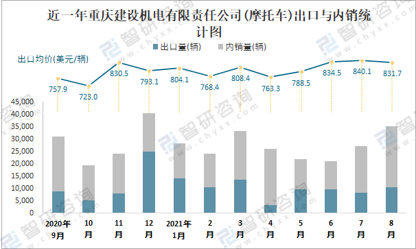 根據(jù)中國汽車工業(yè)(摩托車)產(chǎn)銷快訊數(shù)據(jù)統(tǒng)計可知:近一年重慶建設機電有限責任公司(摩托車)共積壓庫存13293輛,其產(chǎn)銷率存在一定幅度波動,2020年12月產(chǎn)銷率最高(131.61%),清倉庫存9752輛,4月產(chǎn)銷率偏低(75.19%),積壓庫存8632輛;近一年重慶建設機電有限責任公司(摩托車)出口量偏少,銷量以內(nèi)銷為主,總出口量占比總銷量的38.2%,出口均價7月達到最高值,此后有所下滑,其中8月出口量為10473輛,出口均價約為831.66美元/輛;2021年1-8月重慶建設機電有限責任公司(摩托車)累計出口量為79620輛,同比增長37.19%,累計出口金額約為6429萬美元,同比增長62.68%。