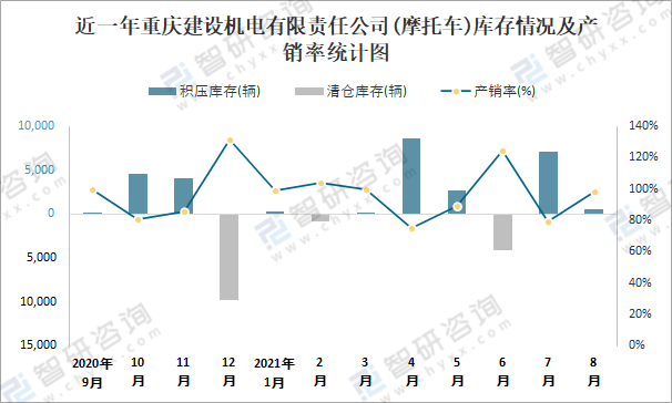 近一年重慶建設機電有限責任公司庫存情況及產(chǎn)銷率統(tǒng)計圖