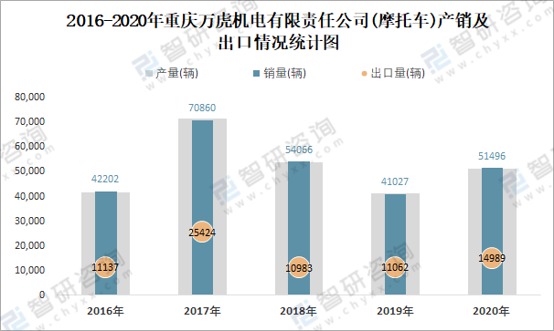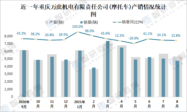 根據中國汽車工業(摩托車)產銷快訊數據顯示:2021年8月重慶萬虎機電有限責任公司(摩托車)產量為5323輛,同比增長36.21%,銷量為4752輛,同比增長15.79%;2021年1-8月重慶萬虎機電有限責任公司(摩托車)累計產量為45047輛,同比增長51.24%,累計銷量為43874輛,同比增長45.17%;2016-2020年重慶萬虎機電有限責任公司(摩托車)產銷量2019年跌至最低值,此后有所回升,且近5年總銷量大于總產量,清倉庫存52輛,出口量偏少,銷量以內銷為主。