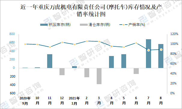 根據中國汽車工業(摩托車)產銷快訊數據統計可知:近一年重慶萬虎機電有限責任公司(摩托車)共積壓庫存1358輛,其產銷率存在一定幅度波動,2月產銷率最高(105.9%),清倉庫存216輛,7月產銷率偏低(88.14%),積壓庫存678輛。