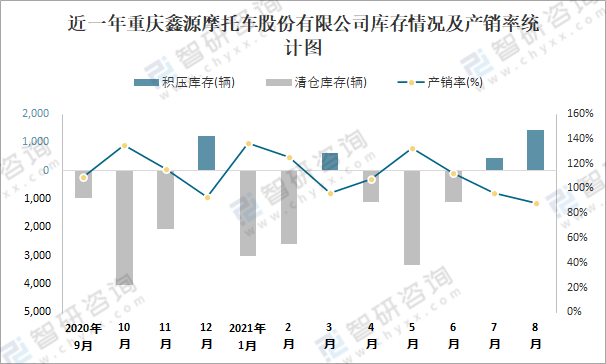 近一年重慶鑫源摩托車股份有限公司庫存情況及產銷率統計圖
