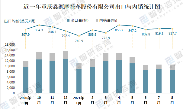 根據中國汽車工業(摩托車)產銷快訊數據統計可知:近一年重慶鑫源摩托車股份有限公司(摩托車)共清倉庫存14541輛,其產銷率存在一定幅度波動,1月產銷率最高(137.06%),清倉庫存3020輛,8月產銷率偏低(88.21%),積壓庫存1421輛;近一年重慶鑫源摩托車股份有限公司(摩托車)總體銷量以出口為主,總出口量占比總銷量的81.3%,出口均價4月達到最高值,此后總體呈現下降趨勢,其中8月出口量為8800輛,出口均價約為817.67美元/輛;2021年1-8月重慶鑫源摩托車股份有限公司(摩托車)累計出口量為80786輛,同比增長47.82%,累計出口金額約為6544.74萬美元,同比增長47.56%。