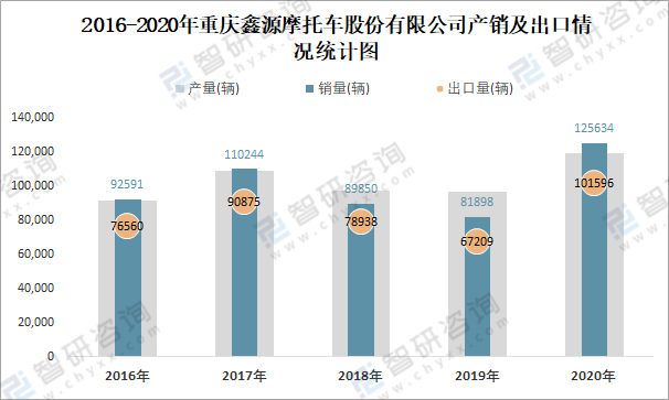 2016-2020年重慶鑫源摩托車股份有限公司產銷及出口情況統計圖