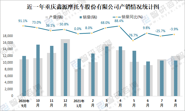 近一年重慶鑫源摩托車股份有限公司產銷情況統計圖