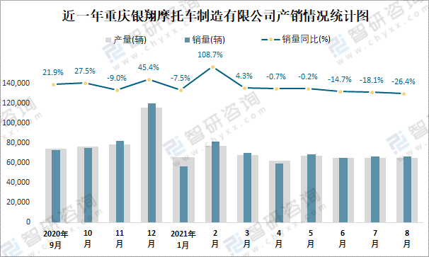 近一年重慶銀翔摩托車制造有限公司產(chǎn)銷情況統(tǒng)計(jì)圖